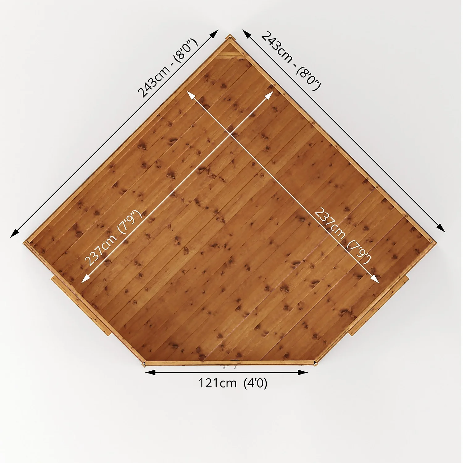 The Ribble corner summerhouse is a unique size summerhouse, ideal for the corner of any garden, great for those looking for somewhere to relax and unwind during the summer months. The spacious and light interior is great for large pieces of furniture, comfy chairs or dining sets, to create the perfect garden retreat. Boasting four large styrene glazed windows and half glazed double doors, the interior is a bright and welcoming.