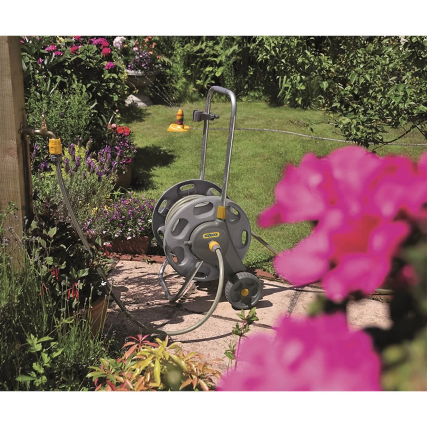 - Connect your Hozelock hose reel or cart to an outdoor tap in seconds