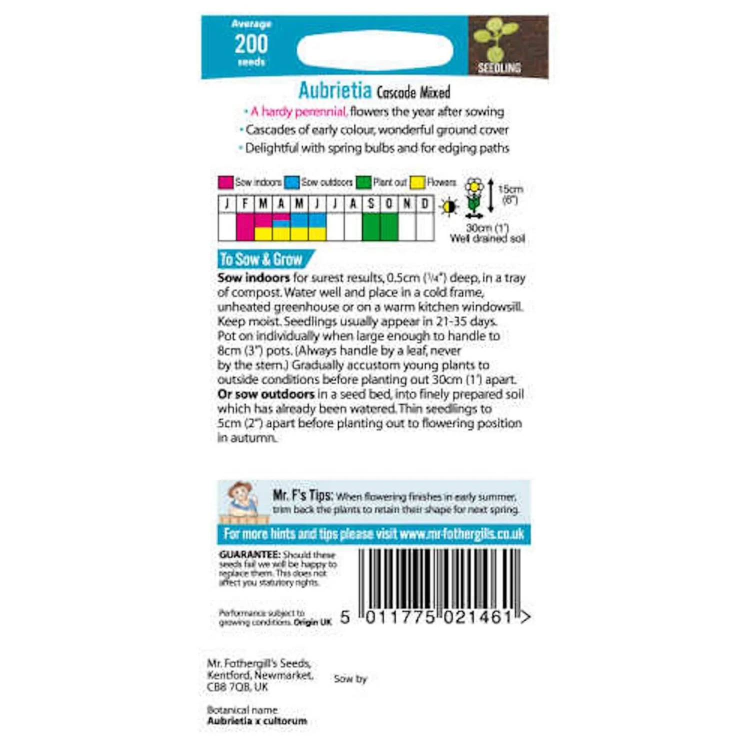 Aubrietia Cascade Mixed (Aubretia cultorum) provides cascades of early colour and is stunning as ground cover. Delightful with spring bulbs in rockeries and edging paths.