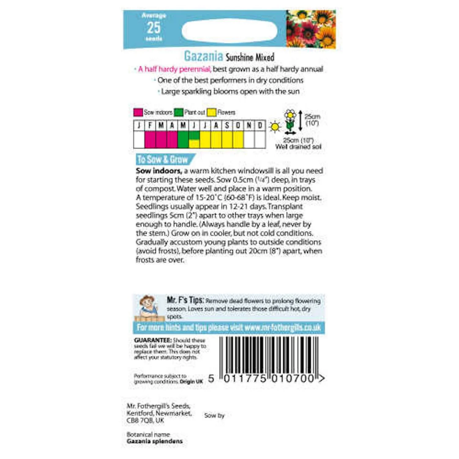Gazania Sunshine Mixed (Gazania splendens) gives glorious displays of large sparkling blooms that open with the sun. Great for beds border edging and containers.