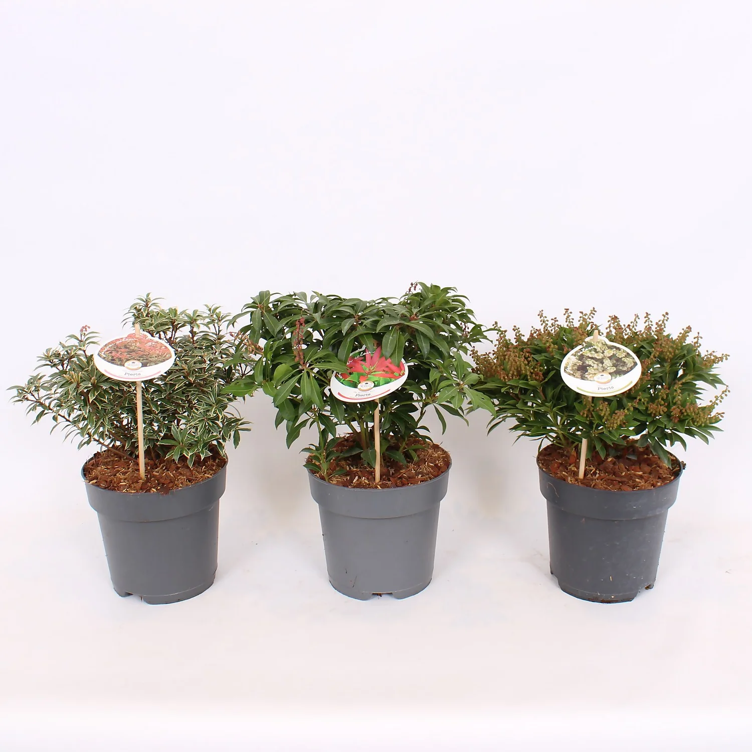 Fiery red leaves follow spires of blush bell-like flower clusters flowers in late Spring and early Summer. Large, glossy evergreen leaves give Winter interest.